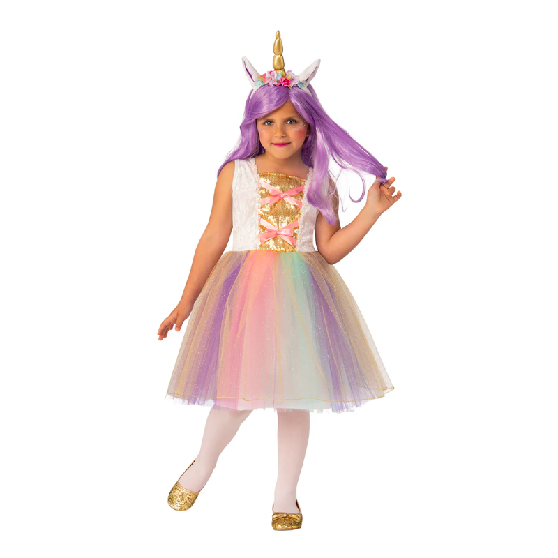 Disfraz de unicornio infantil para niña compuesto por vestido en tonos pastel y diadema con cuerno. Disponible en tallas para niñas de 3-4, 5-7 y 8-10 años.