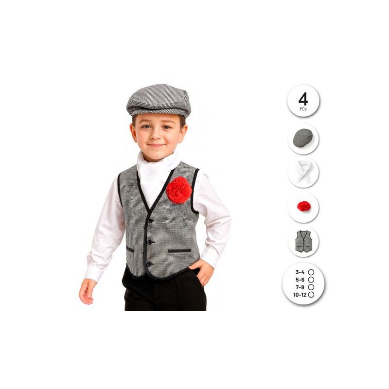 Set de accesorios de chulapo infantil compuesto por chaleco de cuadros, gorra a juego, pañuelo blanco para el cuello y clavel rojo. Disponible en tallas para niños de 3-4, 5-6, 7-9 y 10-12 años.