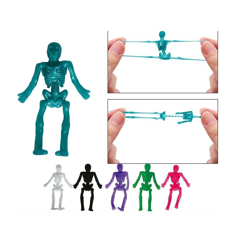 Esqueleto elástico de goma ideal para animar a los más pequeños en fiestas de Halloween y otras celebraciones. Colores surtidos. Precio por unidad. Medida: 10 cm.