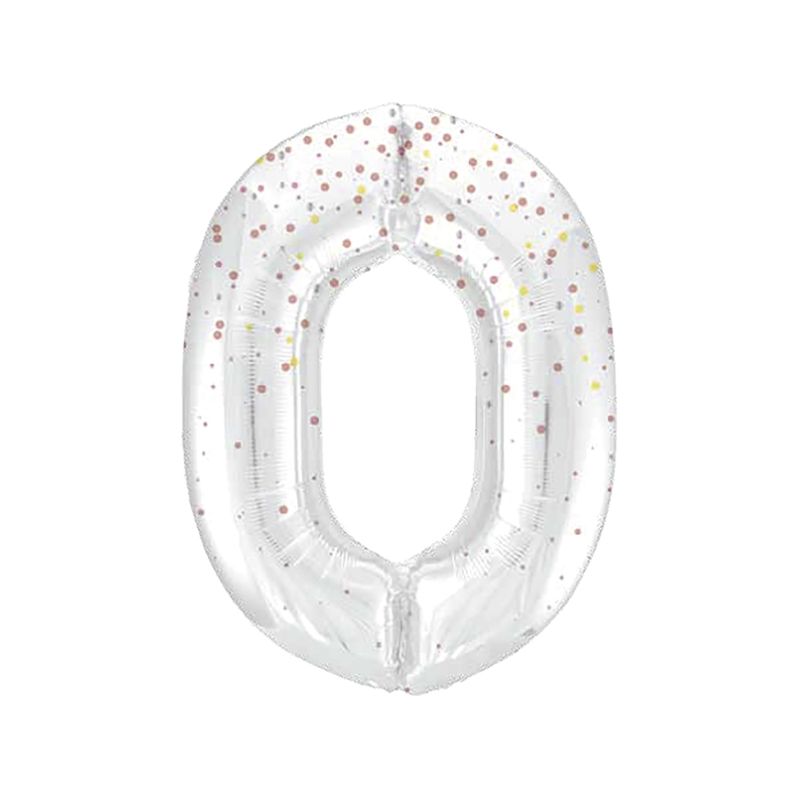 Globo metalizado de foil para helio en forma de número 0. Color blanco impreso con confetti de glitter en colores oro y rosa dorado. Medida: 86 cm de alto. Se envía sin inflar por motivos de transporte.