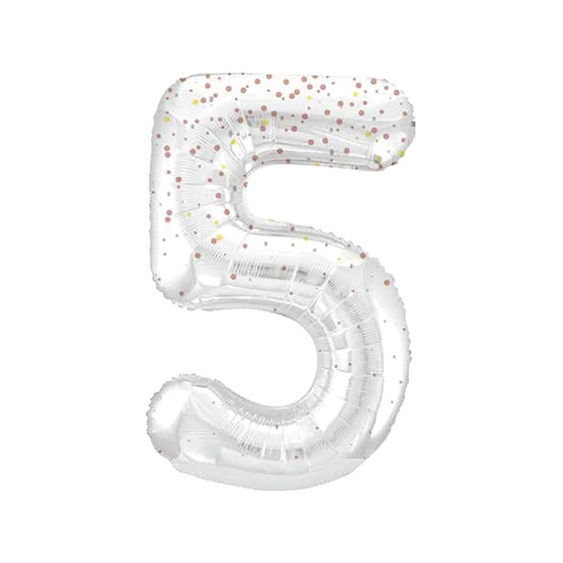 Globo metalizado de foil para helio en forma de número 5. Color blanco impreso con confetti de glitter en colores oro y rosa dorado. Medida: 86 cm de alto. Se envía sin inflar por motivos de transporte.