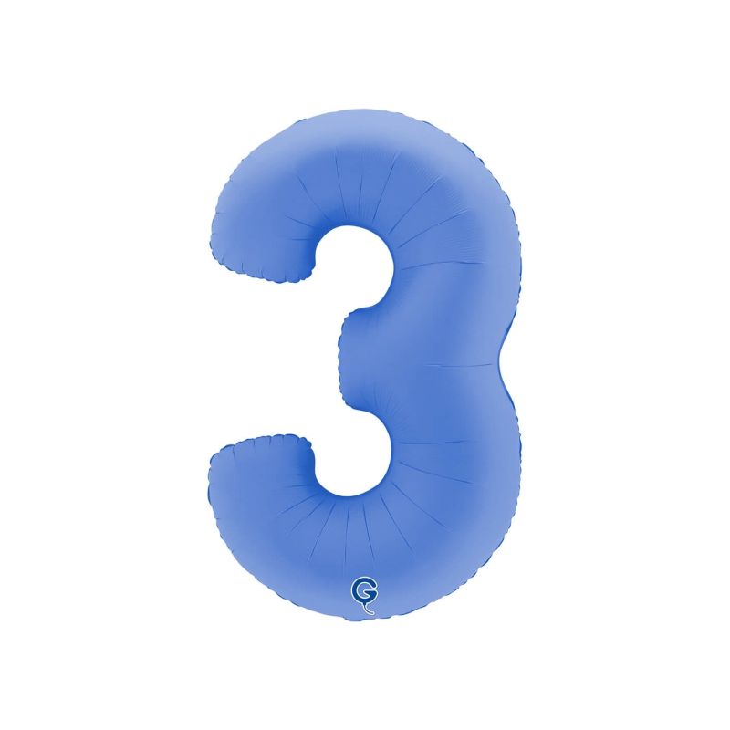 Globo metalizado de foil para helio en forma de número 3. Color azul con efecto mate. Medida: 57 x 94 cm. Se envía sin inflar por motivos de transporte.