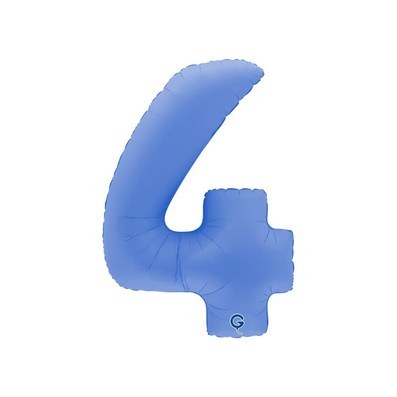 Globo metalizado de foil para helio en forma de número 4. Color azul con efecto mate. Medida: 64 x 92 cm. Se envía sin inflar por motivos de transporte.