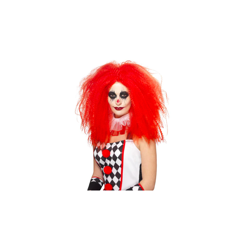 Peluca roja larga con efecto despeinado ideal para complementar tus disfraces de payasa asesina en fiestas de Halloween. Talla única de adulto para mujer.