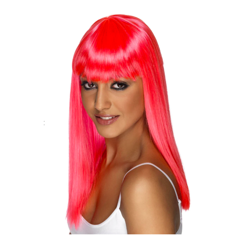 Peluca con media melena de pelo liso rosa y flequillo ideal para crear caracterizaciones y complementar disfraces en fiestas de Carnaval y otras celebraciones. Talla única de adulto para mujer. Otros colores disponibles a parte.