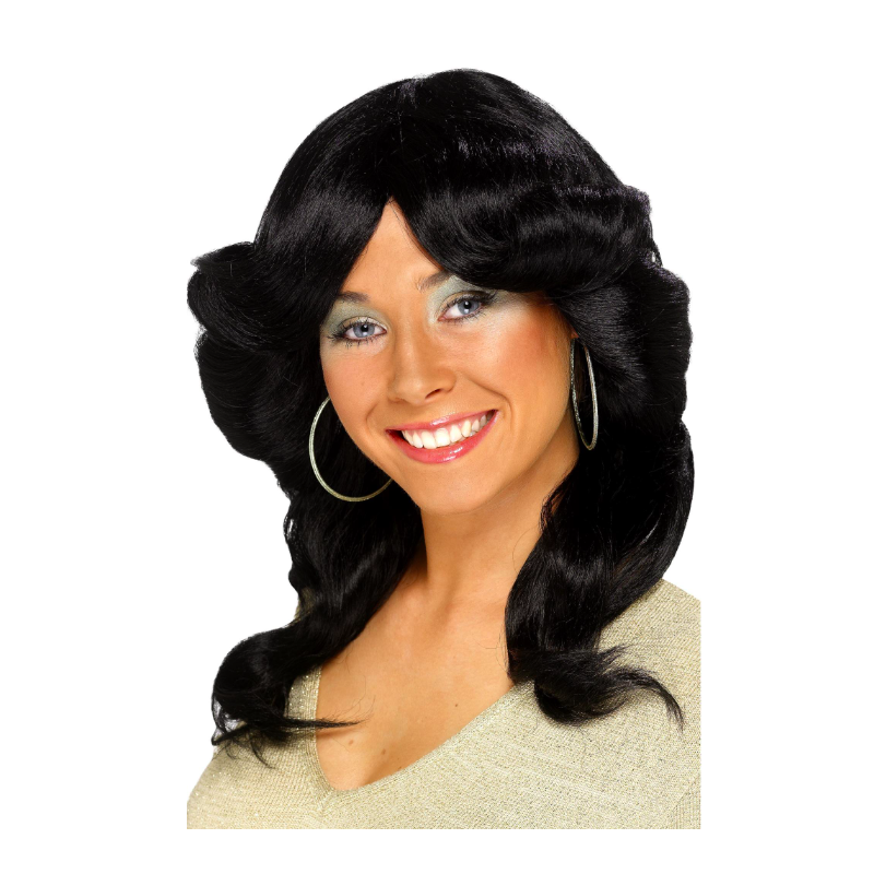 Peluca morena con peinado retro ideal para complementar tus disfraces de los años 70. Talla única para mujer. Otros colores disponibles a parte.