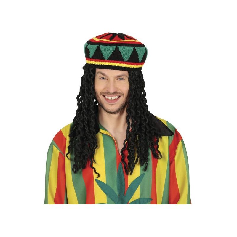 Gorro de punto con los colores jamaicanos rojo, verde y amarillo y rastas incorporadas ideal para complementar tus disfraces de rastafari en fiestas de Carnaval y otras celebraciones. Talla única de adulto para hombre.