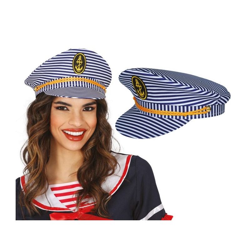 Gorro de capitán a rayas ideal para complementar disfraces de marinera en fiestas temáticas de Carnaval y otras celebraciones. Talla única de adulto para mujer.
