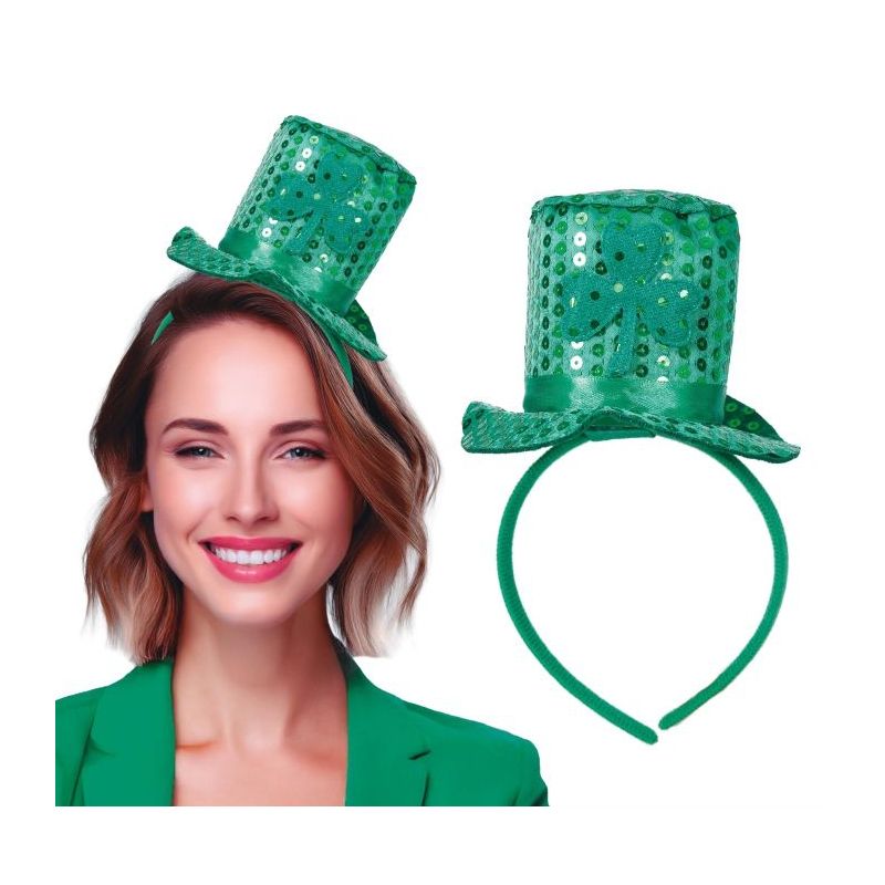 Mini chistera verde con diadema ideal para complementar tus disfraces en fiestas de San Patricio. Talla única de adulto para mujer. Otros modelos disponibles a parte.